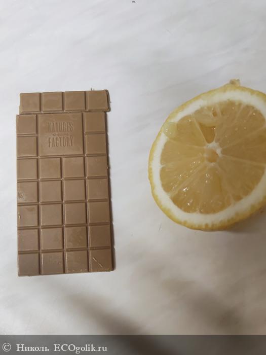 Шоколад светло-коричневого цвета. На плиточке объёмом в 20 грамм написано: NATURE'S FACTORY. Быстро тает. Легко ломается. Во вкусе ощущаются лёгкие нотки имбиря и лимона. Он не приторный, в меру сладкий.