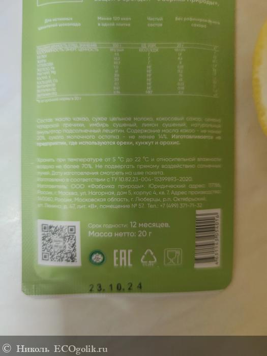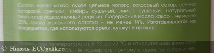 Состав у шоколадки шикарный. Тут: масло какао, сухое цельное молоко, кокосовый сахар, семена татарской гречихи, имбирь сушёный, лимон сушёный, натуральный эмульгатор - подсолнечный лецитин. Содержание масла какао не менее 20%, а сухого молочного остатка - не менее 14%. Есть предупреждение, что изготавливается на предприятии, где используются орехи, кунжут, арахис.