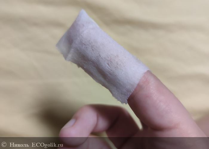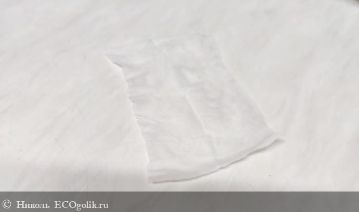 Сама салфеточка небольшая по размеру белого цвета. Она хорошо пропитана, при этом она не сильно мокрая, а слегка влажная. На ощупь мягкая.
