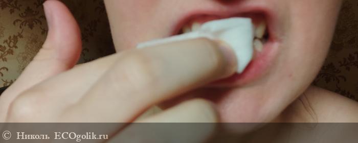 - Заботливо протрите зубы и дёсна мягкой салфеткой, удалив остатки пищи и налёт. (Ребенку зубки нравится чистить такой салфеткой, ибо она сладковатая и мягкая. Но показать решила на себе. Извиняюсь, что может фотография не симпатичная, но сфоткать красиво такой процесс сложно)