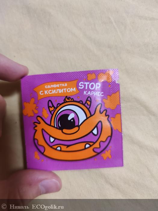 Каждая салфетка в индивидуальной упаковке с изображением зубастого монстрика.