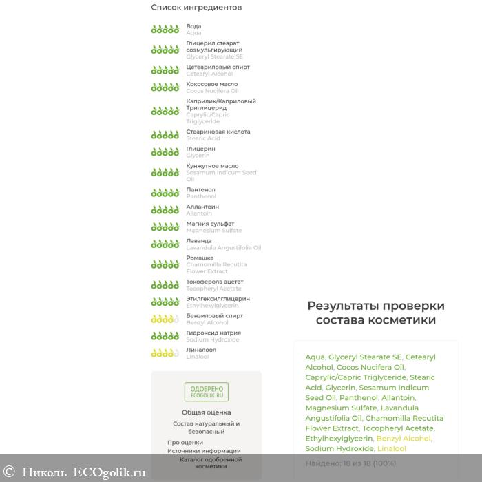 - Lavandula Angustifolia Oil (эфирное масло лаванды) придаёт аромат, является антисептиком, обладает заживляющим, успокаивающим действиями, снимает покраснения.