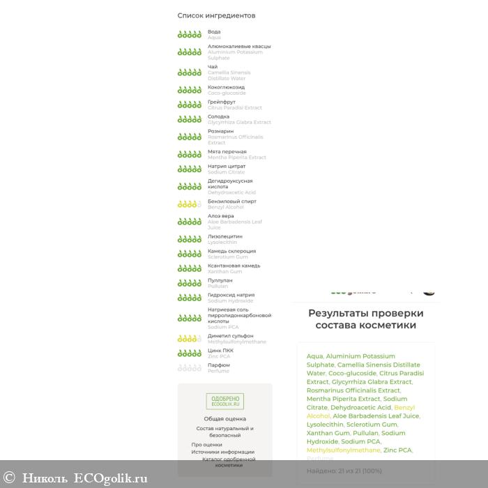 В составе: Aqua, Aluminium Potassium Sulphate, Camellia Sinensis Distillate Water, Coco-glucoside, Citrus Paradisi Extract, Glycyrrhiza Glabra Extract, Rosmarinus Officinalis Extract, Mentha Piperita Extract, Sodium Citrate, Dehydroacetic Acid, Benzyl Alcohol, Aloe Barbadensis Leaf Juice, Lysolecithin, Sclerotium Gum, Xanthan Gum, Pullulan, Sodium Hydroxide, Sodium PCA, Methylsulfonylmethane, Zinc PCA, Perfume