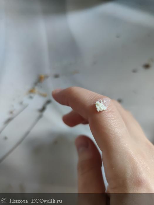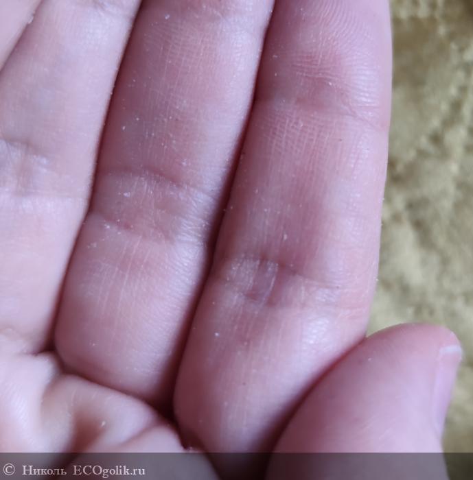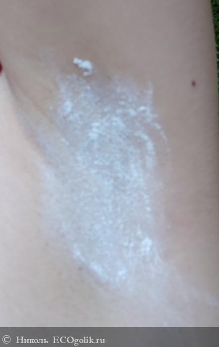 - Легко распределяется по подмышкам и ногам. Но слегка осыпается. (Столько много я не беру, нанесла так, чтобы показать более наглядно).