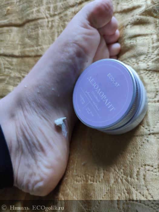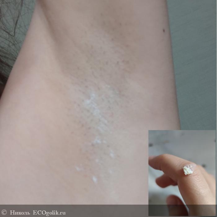 - Применение: небольшую горошину дезодоранта распределить на сухой и чистой коже подмышек. Можно использовать для ног.