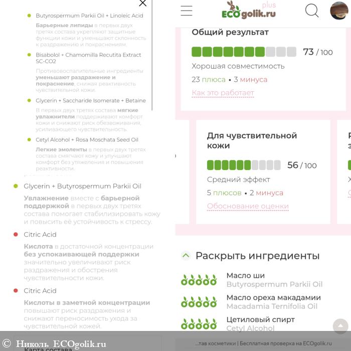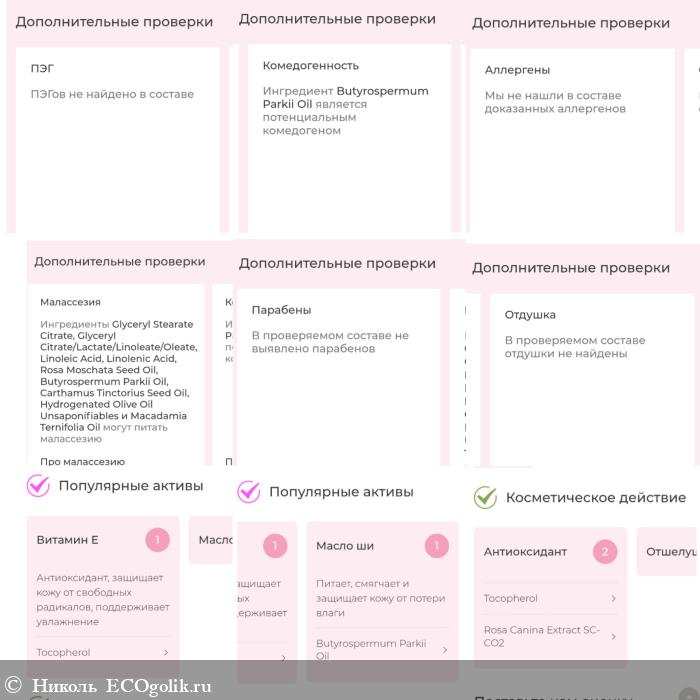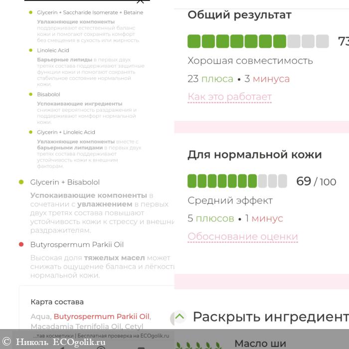 - Интенсивно питает кожу. Учитывая, что состав здесь мощный и масел тут 5 (масло ши, масло макадамии, сафлоровое масло, масло шиповника, гидрогенизированное оливковое масло), но напитанность ощущается, но она не уходит в жирность или не проявляется масляной плёнкой, такого от маски нет.