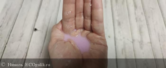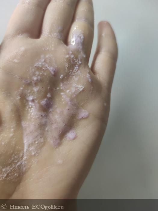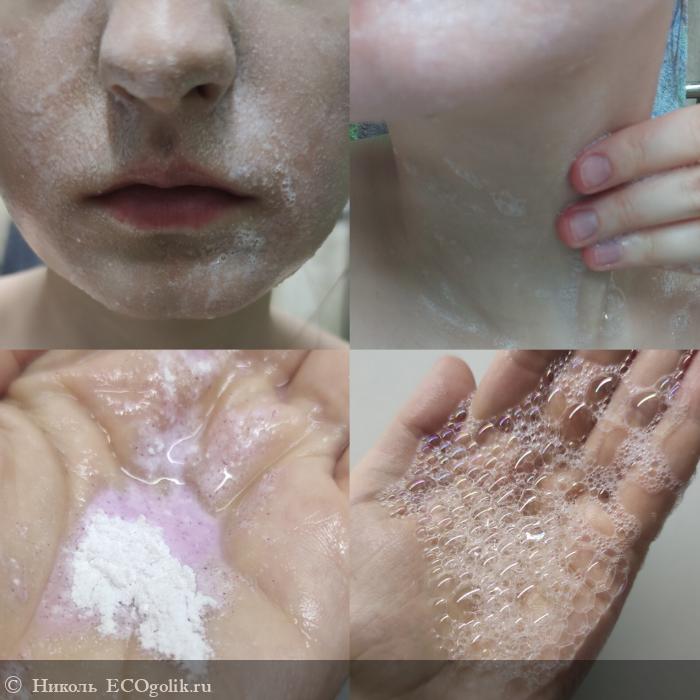 При нанесении, как сказано в инструкции по применению, на влажные ладони, я слегка провела по кругу ещё пальчиком, образуется лёгкая, воздушная пенка. В порошке есть мелкие фиолетовые вкрапления.