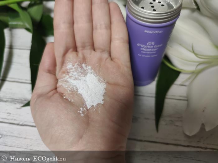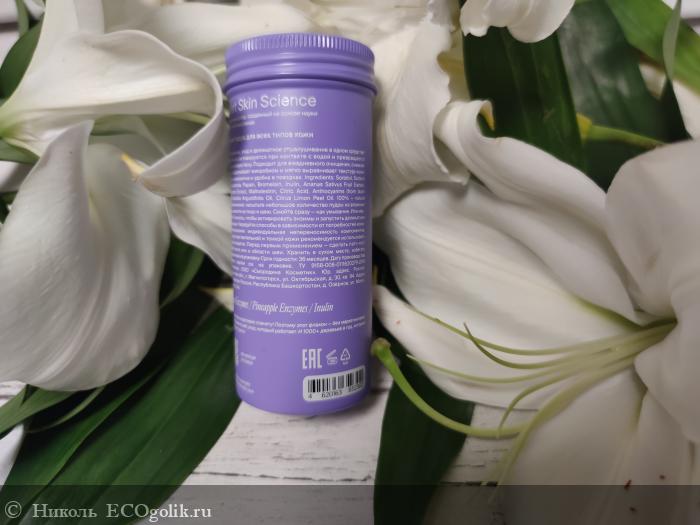 - Энзимка обеспечивает деликатное, но эффективное отшелушивание, убирая ороговевшие клетки, выравнивая тон кожи, делая цвет лица более свежим, не оставляя после себя красноты. (Как были слегка красные щёки у меня до использования этой энзимной пудры, так и после умывания этой энзимной пудры они остались, ярче покраснения не стали. Но вот что цвет лица сам получше стал как-то, в жизни более заметно.)