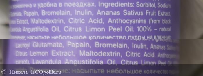 Sorbitol (сорбитол), Sodium Lauroyl Glutamate (растительный аминокислотный ПАВ), Papain (папаин), Bromelain (бромелайн), lnulin (инулин), Ananas Sativus (Pineapple) Fruit Extract (экстракт ананаса), Citrus Limonium Extract (экстракт лимона), Maltodextrin, Citric Acid (лимонная кислота), Anthocyanins (from black carrot), Lavandula Angustifolia (Lavender) Oil (эфирное масло лаванды), Citrus Limon (Lemon) Essential Oil (эфирное масло лимона).