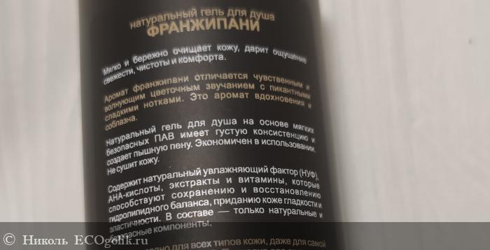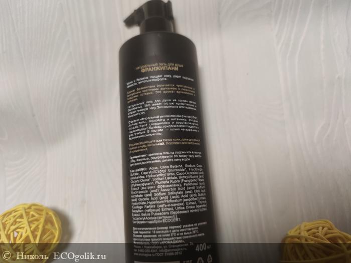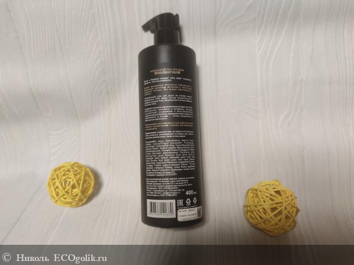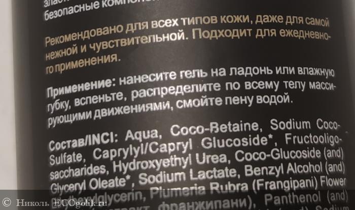 Состав у геля потрясающий. В нём нет синтетических отдушек, искуственных красителей и консервантов, минерального масла, силиконов, химозных плёнкообразователей. Порадовало меня то, что в этом геле для душа аромат франжипани даёт не сам ароматизатор, а есть экстракт франжипани. А ещё, кроме экстракта франжипани, имеются в его составчике: мягкие и безопасные ПАВ, натуральный увлажняющий фактор, гидроксиэтилмочевина, фруктоолигосахарид, AHA-кислоты, пантенол, ниацинамид, экстракты (зверобоя, мать-и-мачехи, чабреца, крапивы, березовых почек), витамин Е.