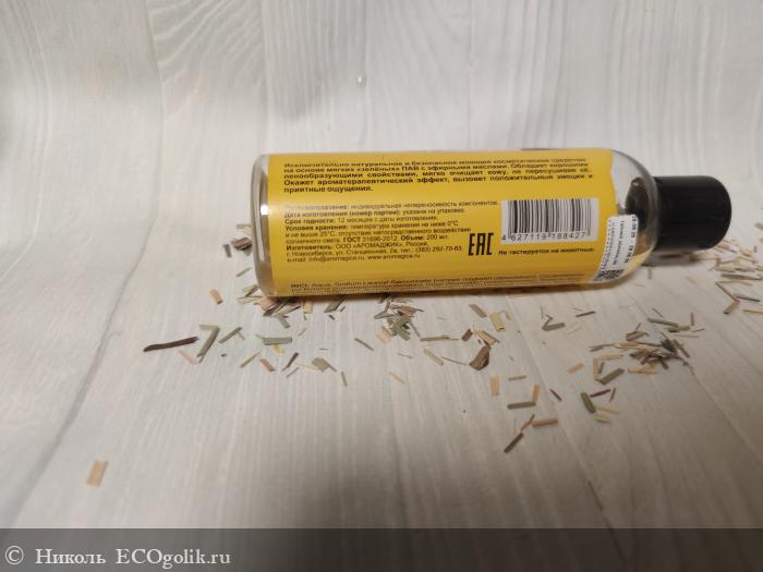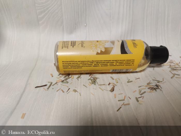 Аромат очень приятный. Я чувствую сначала нотки эфирного масла сандала, потом ноты экстракта ванили, следом нотки эфирного масла лемонграсса и в шлейфе нотки экстрактов имбиря и куркумы. Сочетание таких эфирных масел и экстрактов оказывают ароматерапевтический эффект, вызывая только положительные эмоции. После смывания геля с кожи аромат остаётся в течение 4 часов.