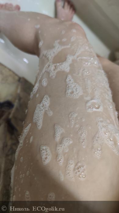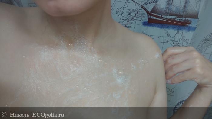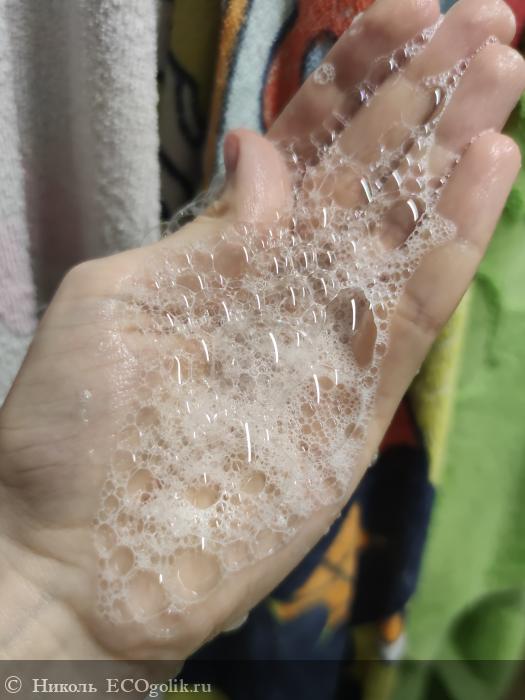 - Отлично пенится. (При нанесении на мочалку, будет более пышной пенка, её будет больше.) Пена лёгкая, нежная, воздушная, белого цвета, она образуется за счёт таких ПАВ, как: натрия лауроил саркозинат, кокамидопропилбетаин, кокоглюкозид, сорбитана сесквикаприлат, глицерил лаурат.