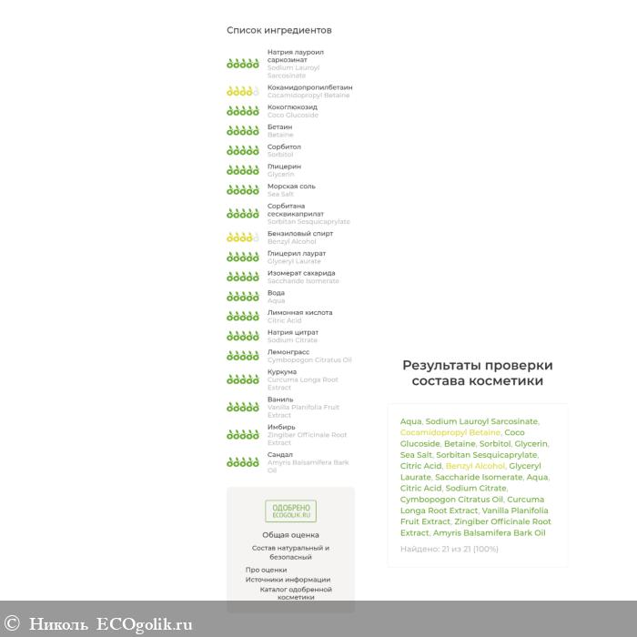 Состав отличный, написан по INCL и переведён на русский язык. В нём нет силиконов минерального масла, продуктов животного происхождения, парабенов, сульфатов, искуственных красителей и консервантов, синтетических ароматизаторов.Состав одобрен этим сайтом.