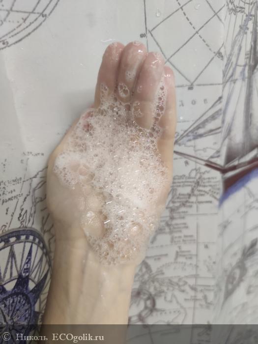 - Хорошо пенится за счёт таких ПАВ, как: коко-сульфат натрия, кокамидопропилбетаин, кокоглюкозид, лауроил саркозинат натрия. Облачко пены воздушное, лёгкое, пушистое получается.