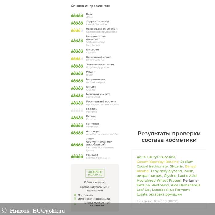 В нём я хочу выделить следующие компоненты, такие как: глицерин, этилгексилглицерин, бетаин, экстракт ромашки, гель алоэ вера, пантенол, лизат ферментированных лактобактерий, гидролизованный протеин пшеницы, глицин, молочная кислота.