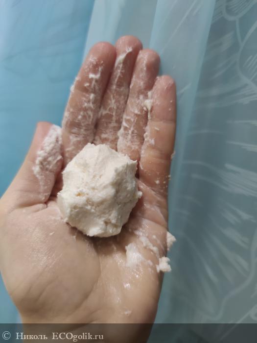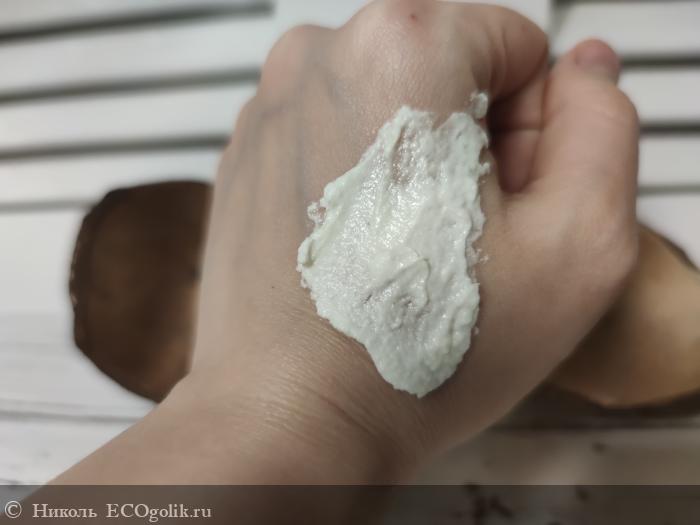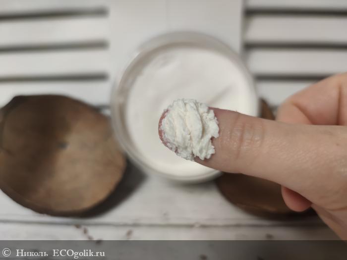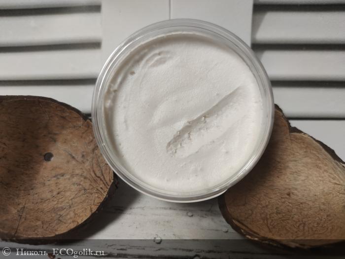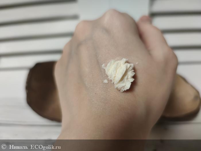Текстура у этого гель-крема воздушная, будто взбитые сливки или суфлешный мусс положили в баночку. Но сначала она твёрдой. При этот шампунь не осыпается при нанесении.