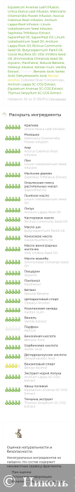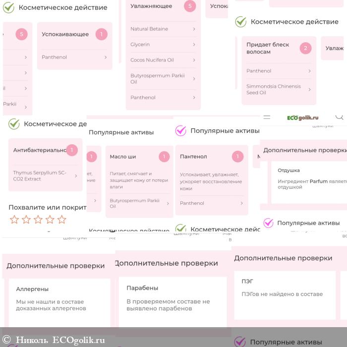 Сначала указан отличный состав, в котором нет искуственных красителей, консервантов, ПЭГ, сульфатов, аллергенов, продуктов животного происхождения.