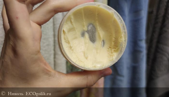 После снятия крышки, я увидела мусс светло-жёлтого цвета с пузырьками. Этот гель-крем внешне и по тактильным ощущениям напоминает муссовый торт или густые, взбитые сливки.