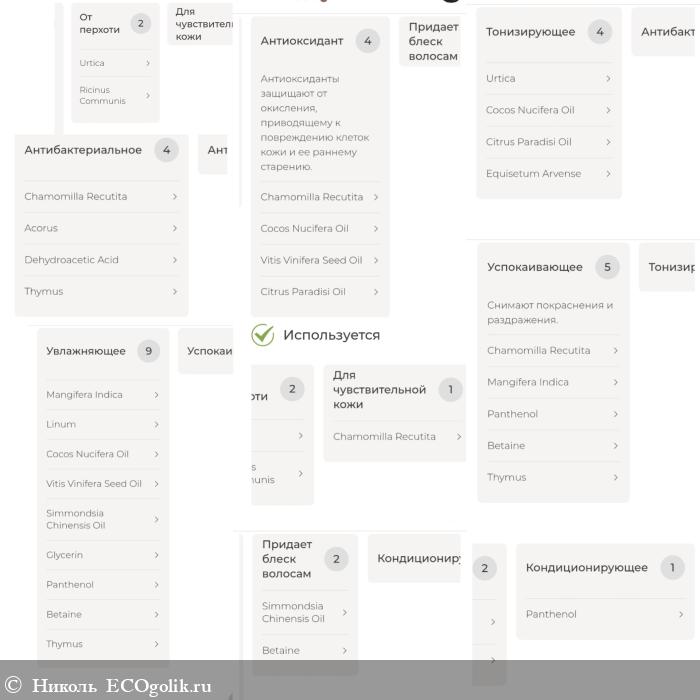 - Urtica Dioica Leaf (крапивы) Infusion обладает антисептическими свойствами, стимулирует микроциркуляцию, нормализует секрецию, предотвращает выпадение волос, стимулирует рост волос, тонизирует кожу, обладает бактерицидным, себорегулирующим, дезодорирующим, противовоспалительным действиями. Помогает в борьбе с выпадением.