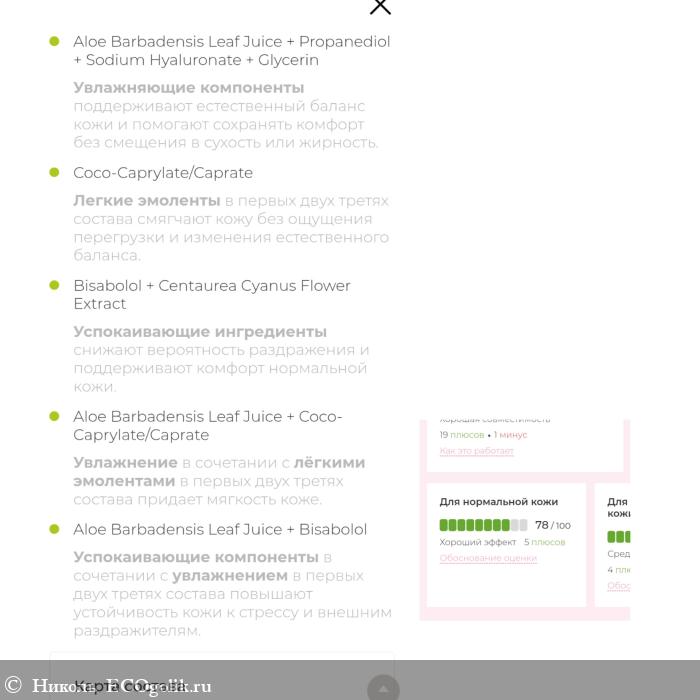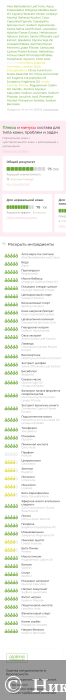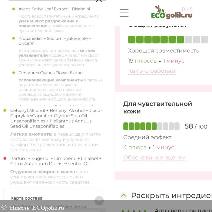 Теперь посмотрим эффективность. Общий результат в 73% кроликом-экоголиком оценён. Он заявляет, что для моей кожи - это хорошая совместимость, выделяет 19 плюсов и 1 минус.