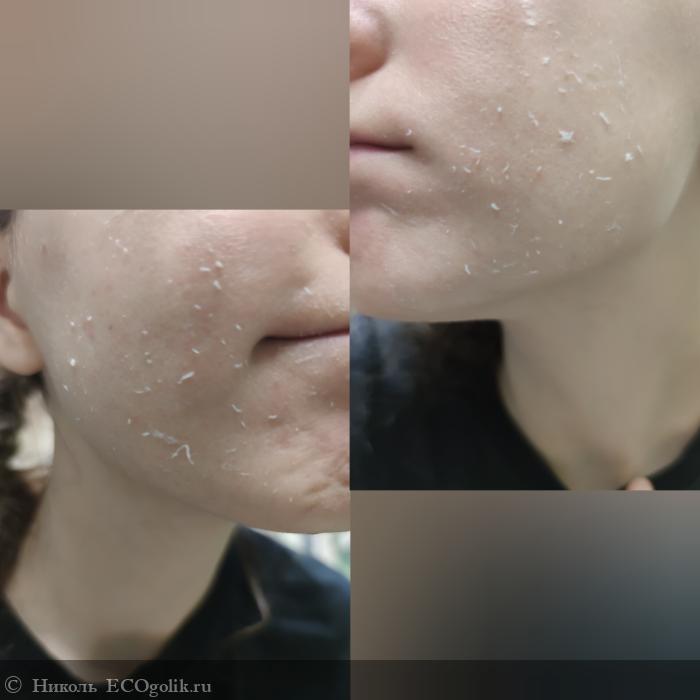 Есть один нюанс. Если Вы его будете долго размазывать по коже лица и возьмёте многовато, он может вот так скатываться. Выход: брать немного и размазывать быстро. Или наносить на слегка влажную кожу, например, предварительно гидролат попшикать на кожу лица.