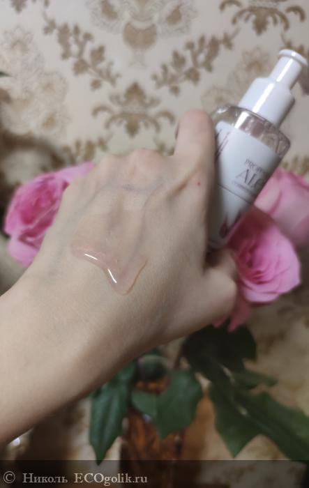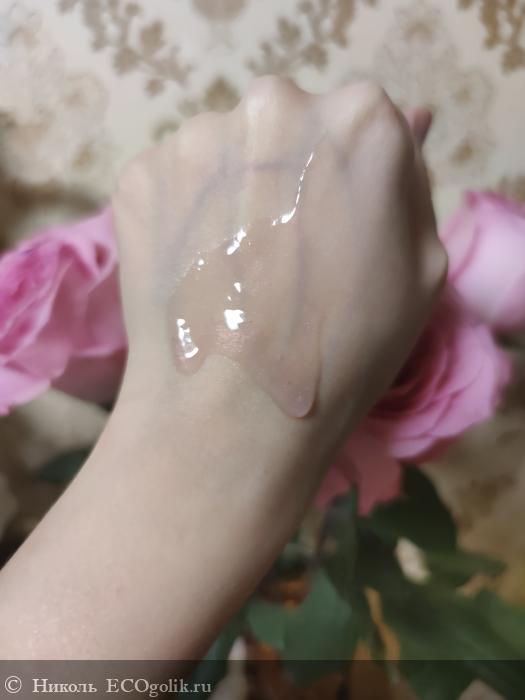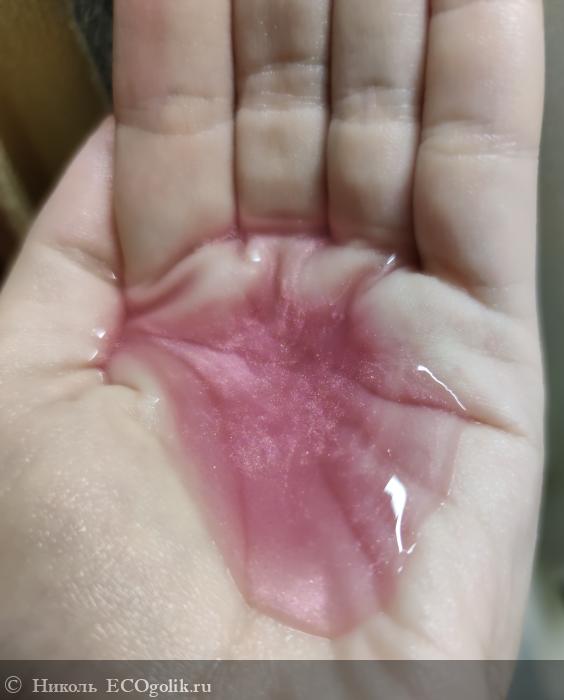 Средство имеет консистецию средней густоты, гелевой текстуры с перламутровым отливом. В геле есть шиммер, но на коже эти блёстки не остаются. Они с лёгкостью смываются водой.