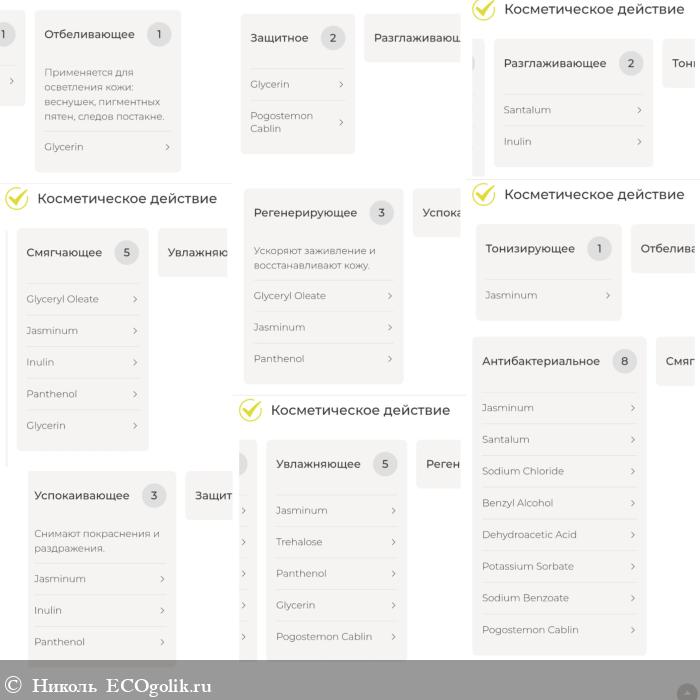 - Jasminum Officinale Flower Extract (экстракт жасмина) смягчает, увлажняет, тонизирует, регенерирует, успокаивает, очищает, устраняет раздражение, снимает покраснения. Придаёт аромат.