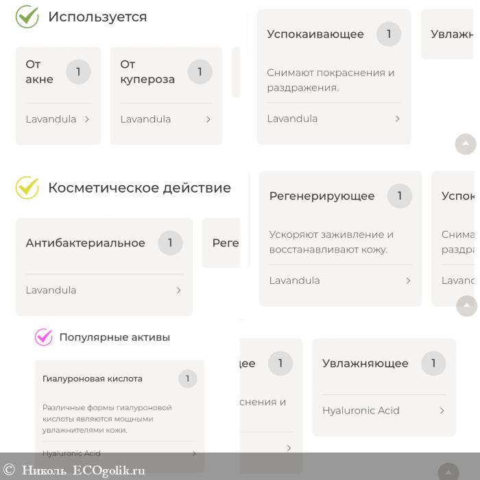 - Гидролат лаванды - антисептик, придаёт аромат, успокаивает, снимает раздражение, покраснения, зуд, чувство стянутости. Улучшает цвет кожи, заживляет. Обладает противовоспалительным, регенерирующим действиями.