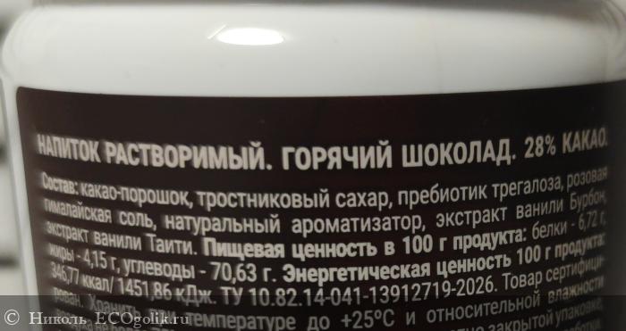- В составе: какао - порошок, тростниковый сахар, пребиотик трегалоза, розовая гималайская соль, натуральный ароматизатор, экстракт ванили Бурбон, эктракт ванили Таити.