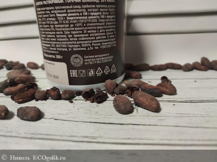 Горячий шоколад хранится в пластиковой банке. Напиток был упакован в картонную коробочку и пупырку. На фотографиях какао-бобы.