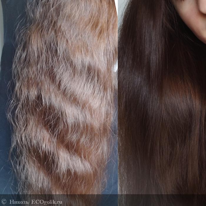 - Хорошо смягчает и укрепляет, защищает от ломкости. (Слева расчесала расчёской, справа пальчиками.)