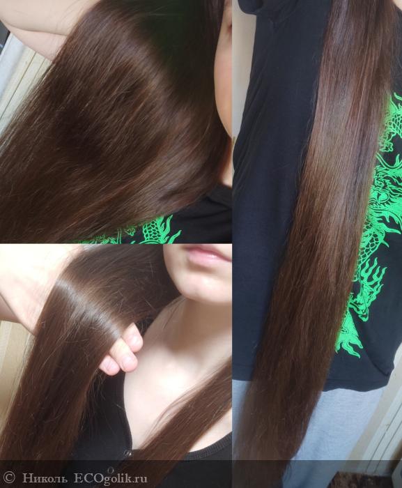 - Прекрасно смягчает шевелюру, на ощупь волосы становятся такими мягкими, что из можно сравнить с шёлком. Волосы на 4 день после их помывки и использования этого кондиционера при искусственном освещении сделаны фотографии.