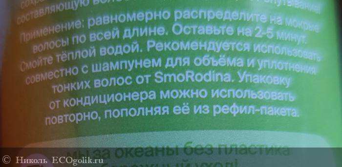 - Применение: равномерно распределите на мокрые волосы по всей длине. Оставьте на 2-5 минут. Смойте тёплой водой. Рекомендуется использовать совместно с шампунем для объёма и уплотнения тонких волос от Smorodina. Упаковку от кондиционера можно использовать повторно, пополняя её из рефил-пакета.
