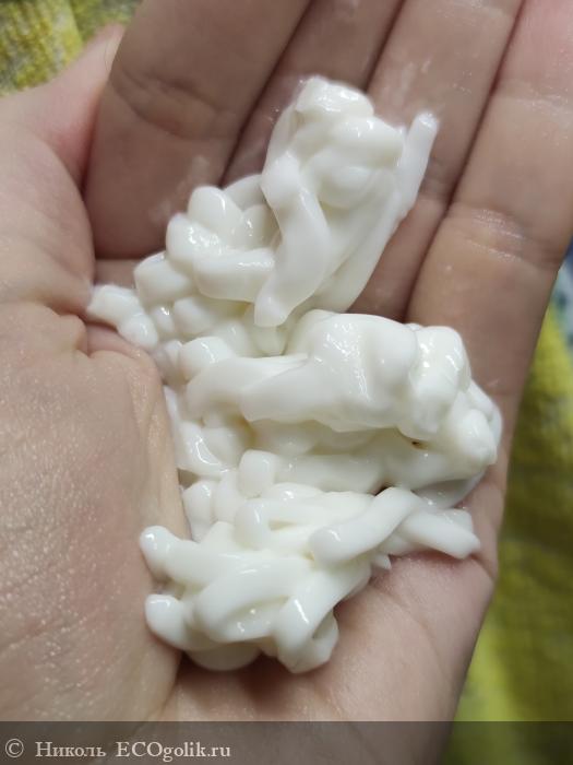 Консистенция у кондиционера достаточно густая, плотная, хорошо держащаяся форму, кремовой текстуры, белого цвета.