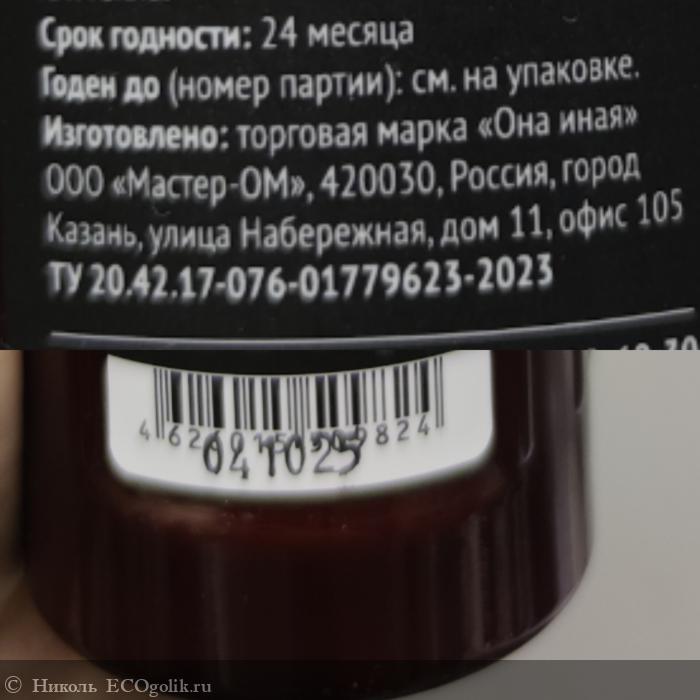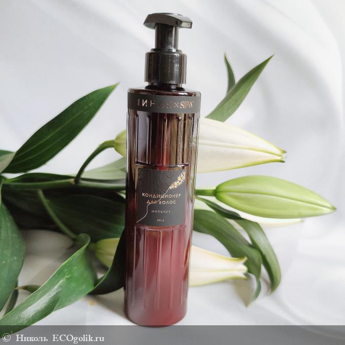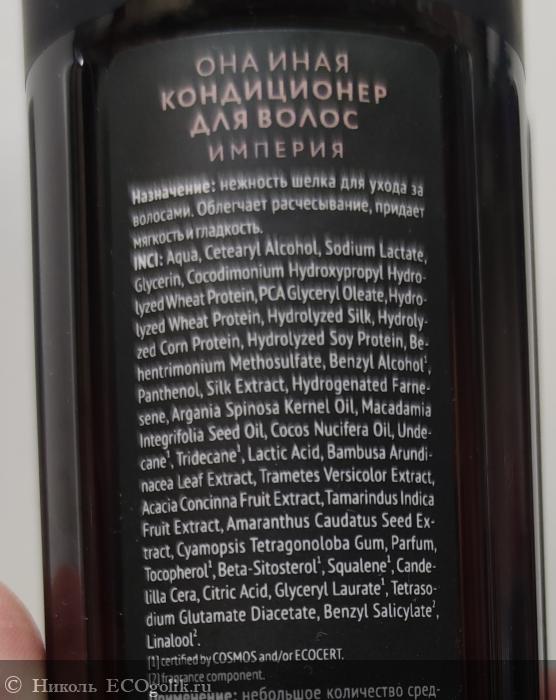 Объём флакончика 240 мл. На лицевой стороне красивые золотые буквы ОНА ИНАЯ × SFW Империя, написано, что это кондиционер для волос. Указан его объём. И симпатичный лепесток. А так же хочу отметить, если внимательно рассмотреть эту чёрную наклейку, то на ней можно увидеть годовые кольца дерева, которые как раз дают понять, что в аромате средства присутствует древесный аккорд.