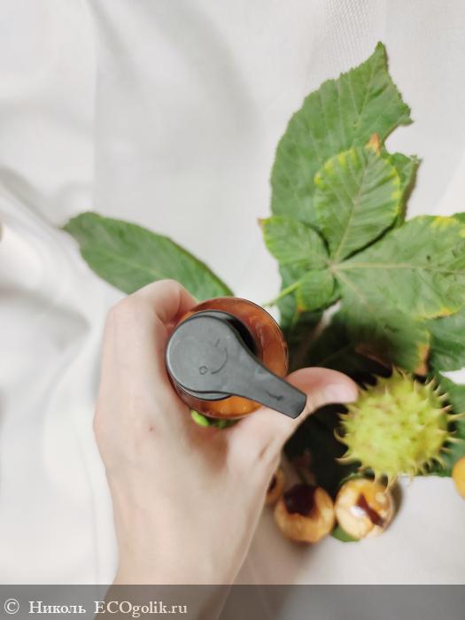 Дизайн кондиционера минималистичный, акцентное изображение, входящих в состав компонентов, подчёркивает натуральность средства. Сбоку на влагоустойчивой наклейке имеется рисунок каштана и листочки центеллы азиатской (готу-колы), красуются линии белых волн, напоминающие мне завиток волос.