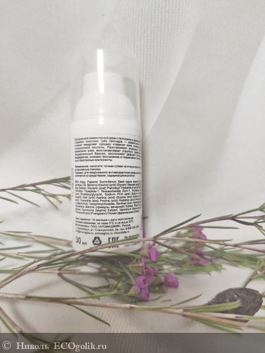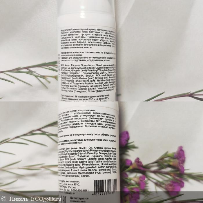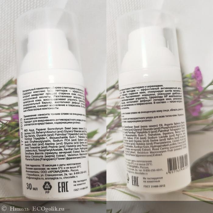 У крема прекрасный состав. Он богат на полезные компоненты. В нём нет силиконов, минерального масла, искуственных красителей и консервантов, синтетических ароматизаторов. Крем даёт комплексный эффект, чем он мне понравился за счёт своих активов. Люблю, когда всё сразу можно получить от средства. Меня сразу же привлекли следующие ингредиенты: комплекс трёх пептидов (Palmitoyl Tripeptide-5, Palmitoyl Tetrapeptide-7, Palmitoyl Tripeptide-1, Phospholipids, Ceramide NP, множество аминокислот в составе, сквалан, глицерин, витамин Е, масла (семян мака и арганы) и много экстрактов (примулы вечерней, шиповника, мирта, клюквы, франжипани)