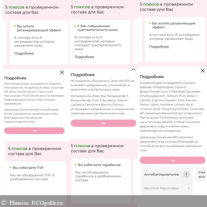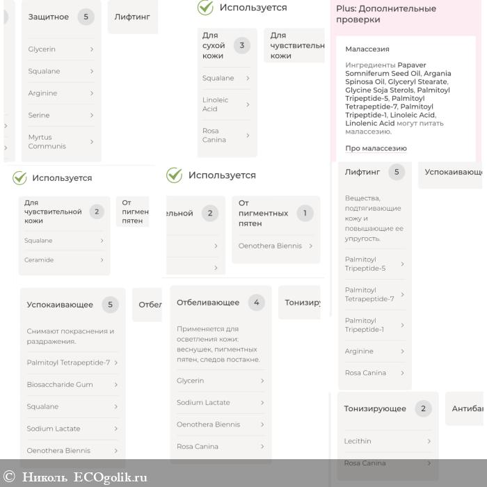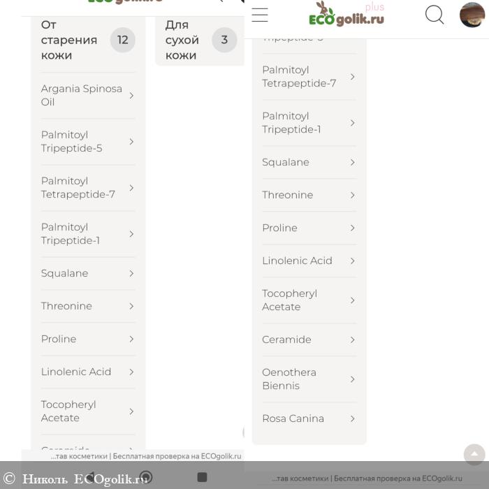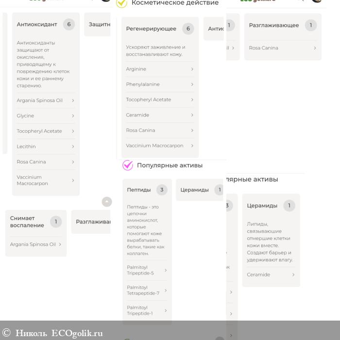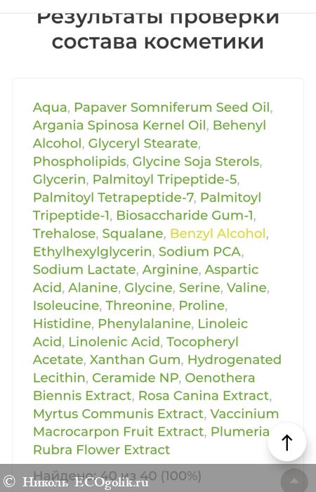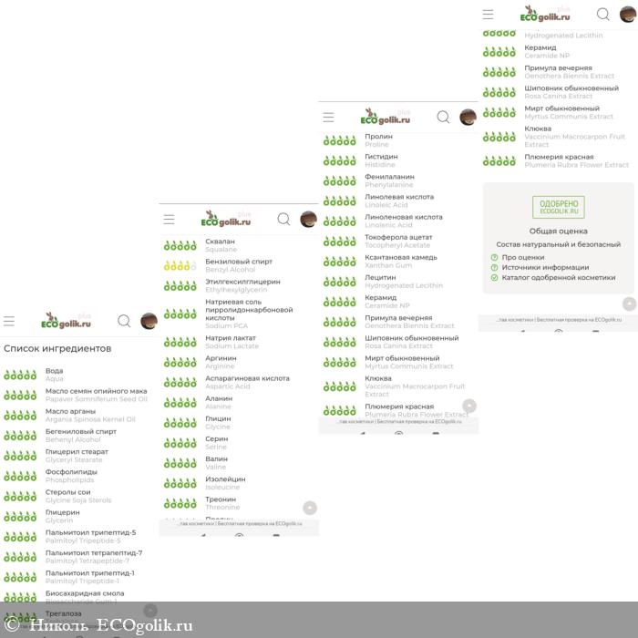 Состав одобрен этим сайтом. В нём присутствуют такие компоненты: Aqua, Papaver Somniferum Seed (мака семян) Oil, Argania Spinosa Kernel (арганы) Oil, Behenyl Alcohol (and) Glyceryl Stearate (and) Phospholipids (and) Glycine Soja Sterols, Glycerin (and) Palmitoyl Tripeptide-5 (and) Palmitoyl Tetrapeptide-7 (and) Palmitoyl Tripeptide-1, Biosaccharide Gum-1, Trehalose, Squalane, Benzyl Alcohol (and) Ethylhexylglycerin, Sodium PCA (and) Sodium Lactate (and) Arginine (and) Aspartic Acid (and) Alanine (and) Glycine (and) Serine (and) Valine (and) Isoleucine (and) Threonine (and) Proline (and) Histidine (and) Phenylalanine, Linoleic Acid (and) Linolenic Acid, Tocopheryl Acetate, Xanthan Gum, Hydrogenated Lecithin, Ceramide NP, Oenothera Biennis (примулы вечерней) Extract, Rosa Canina (шиповника) Extract, Myrtus Communis (мирта) Extract, Vaccinium Macrocarpon Fruit (клюквы) Extract, Plumeria Rubra (Frangipani) Flower (франжипани) Extract.