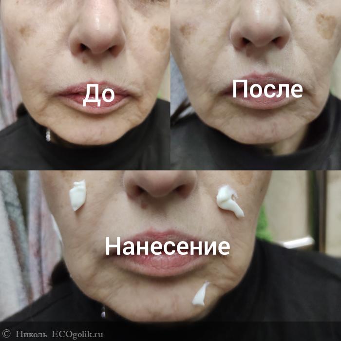 Так как крем антивозрастной, то я его наносила его на лицо своей мамы, когда она мне давала, ибо сама забывала. Её сразу подкупил лёгкий аромат. Если аромат ей не нравится, она мне не разрешает что-то наносить ей попробовать. Моя мама любит мазаться кремами, но делает это не часто, больше по настроению, когда находит на это время. Понимает, что надо регулярно, но не получается. Этот крем ей понравился. Я попросила её подробно поделиться своими впечатлениями. Пишу слова своей мамы: "Большой плюс хочу выделить в том, что крем впитывается быстренько и размазывается легко по коже лица. Аромат мне понравился, он лёгкий, цветочно-свежий, на мой нюх. Не оставляет жирного блеска, как бывает от мощных средств с насыщенным составом. Отлично устраняет лёгкое чувство стянутости кожи, сухость, избавляет от небольших шелушений, хотя у меня эти неприятности редко. Но как только я ощущала это - брала этот крем и наносила. Он в миг решал мои проблемы, которые у меня возникали. Крем не ощущается на коже. Убирает шершавость с кожи, делает её более нежной и мягкой на ощупь. Порадовало, что крем не ощущается на коже. Так как наносила я его не часто, кожа относительно нормальная, да и мазюкать забываю вечно, то сказать антивозрастной эффект мне сложно. Если б пользовалась чаще, наверное, б заметила уменьшение носогубной складки и осветление пигментных пятен. По фото вряд ли будет видна разница, ибо освещении отличается, но в жизни она видна и ощутима. Кожа более ухоженной выглядит. Спасибо, ChocoLatte ."