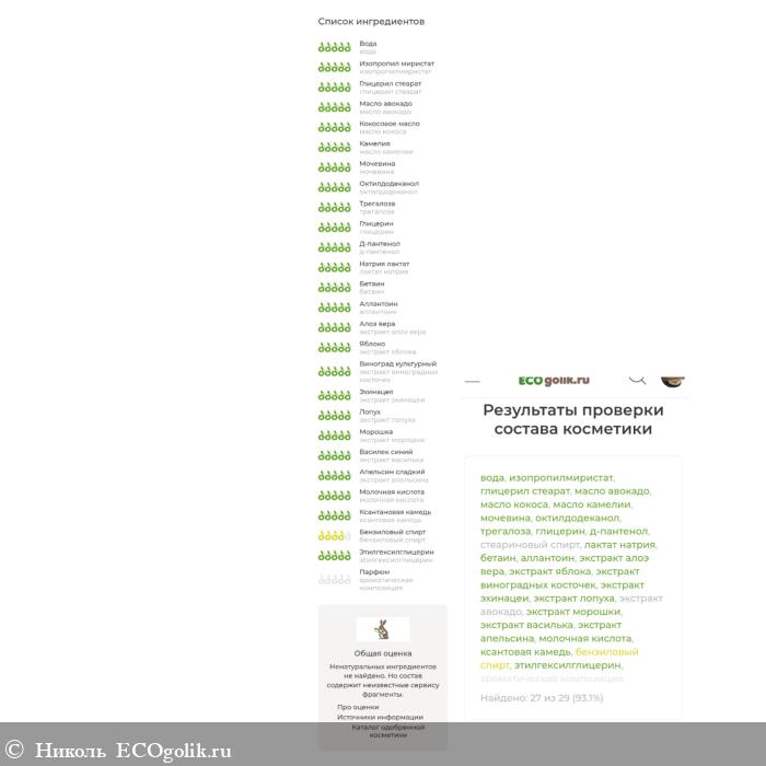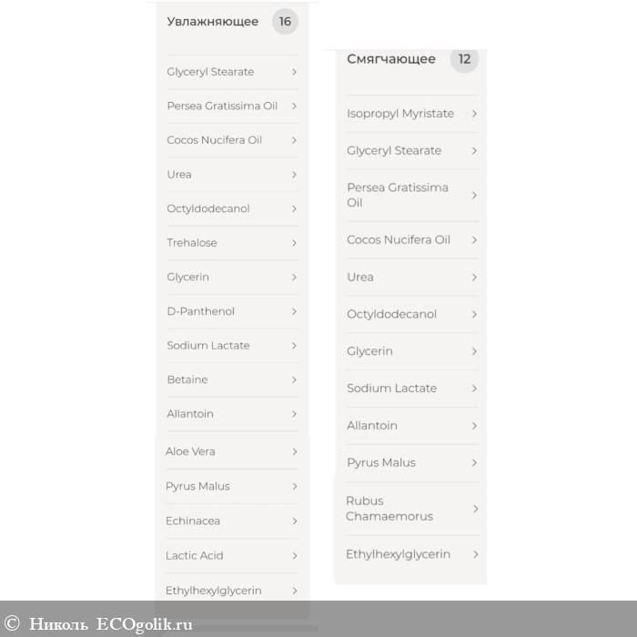 В составе: вода, изопропилмиристат, глицерил стеарат, масло авокадо, масло кокоса, масло камелии, мочевина, октилдодеканол, трегалоза, глицерин, д-пантенол, стеариновый спирт, лактат натрия, бетаин, аллантоин, экстракт алоэ вера, экстракт яблока, экстракт виноградных косточек, экстракт эхинацеи, экстракт лопуха, экстракт авокадо, экстракт морошки, экстракт василька, экстракт апельсина, молочная кислота, ксантовая камедь, бензиловый спирт, этилгексилглицерин, ароматическая композиция.