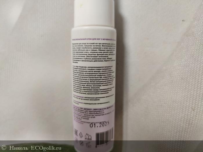 После указан классный состав средства. Он богат на полезные компоненты. В нём нет силиконов, искусственных красителей и консервантов, минерального масла. А процент мочевины аж 10%