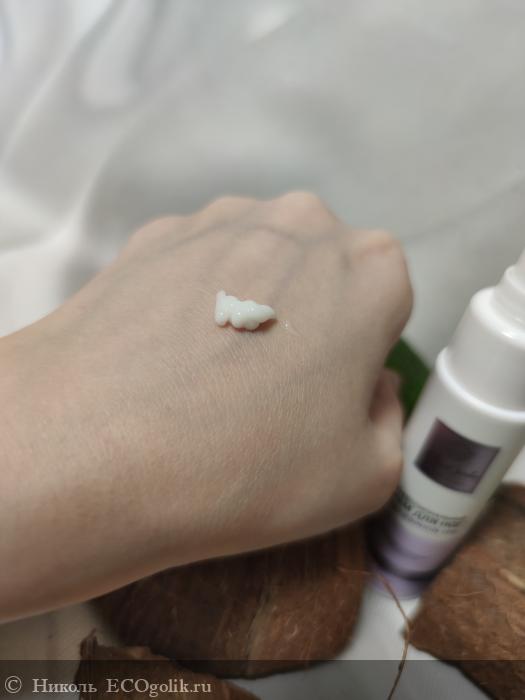 У средства кремовая консистеция, нежнейшая текстура, белого цвета, средней густоты и плотности.