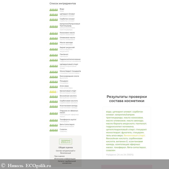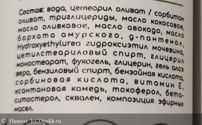 Состав натуральный, безопасный. В нём нет искуственных красителей консервантов, синтетических ароматизаторов, минерального масла, силиконов. Он имеет универсальную формулу, подходящую для всех типов кожи и всей семьи, в том числе для детей. В составе хочется выделить следующие компоненты, на которые я обратила внимание в первую очередь, такие как: масла (кокоса, оливы, авокадо, амурского бархата), д-пантенол, гидроксиэтилмочевина, фукогель, глицерин, гель алоэ вера, токоферол, бета-ситостерол, сквален.
