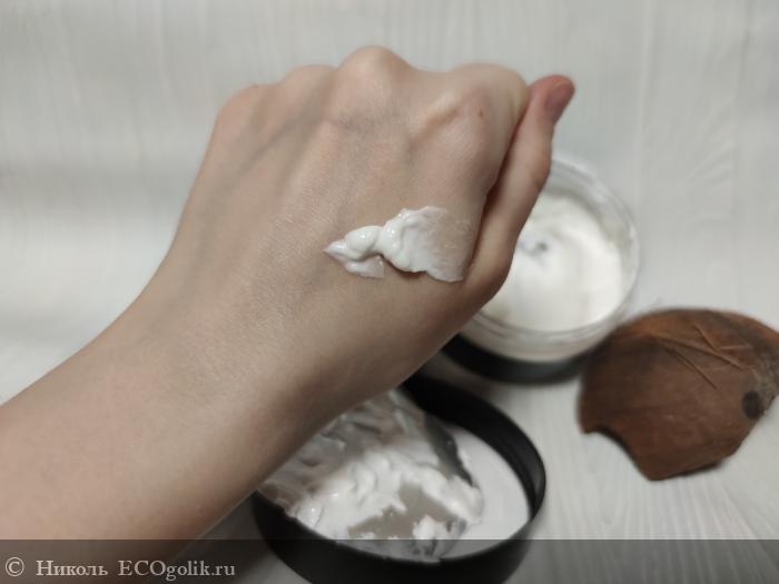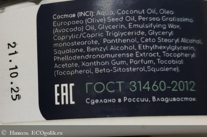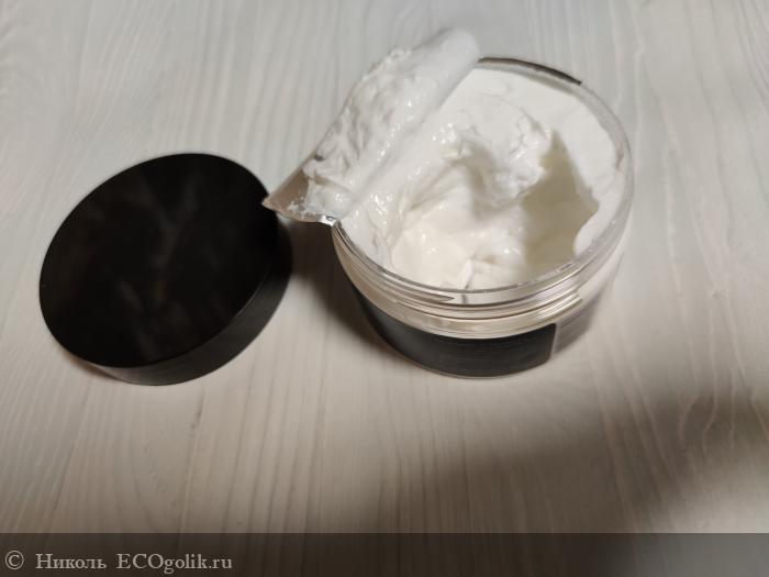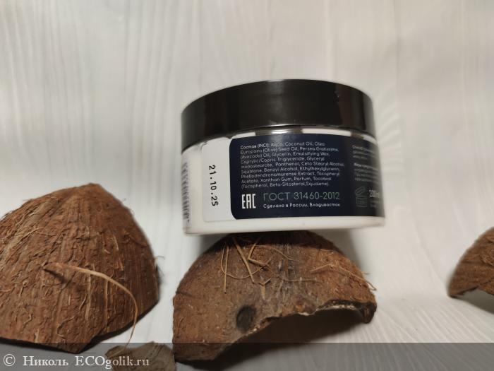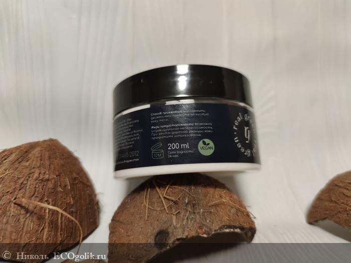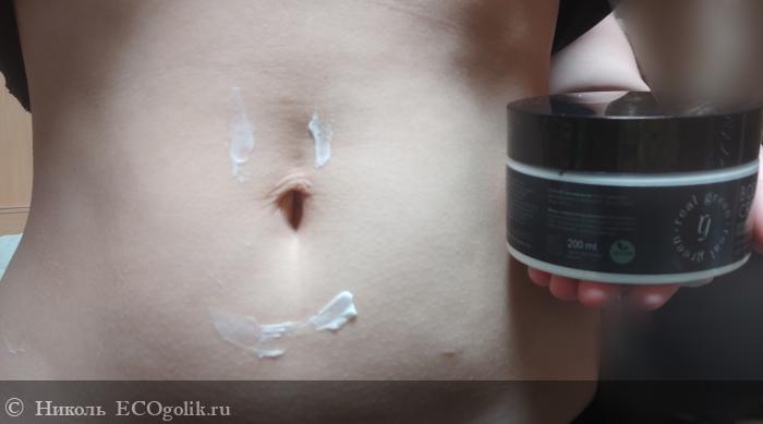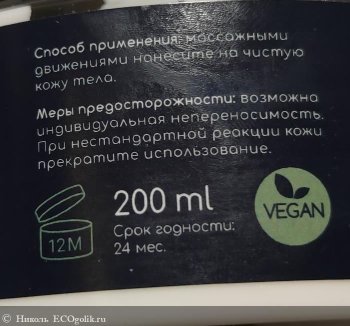 Крем для тела хранится в пластиковой банке в объёме 200 мл, на которую наклеена влагоустойчивая этикетка со всей информацией о нём. Оформление баночки минималистичное, что мне нравится.