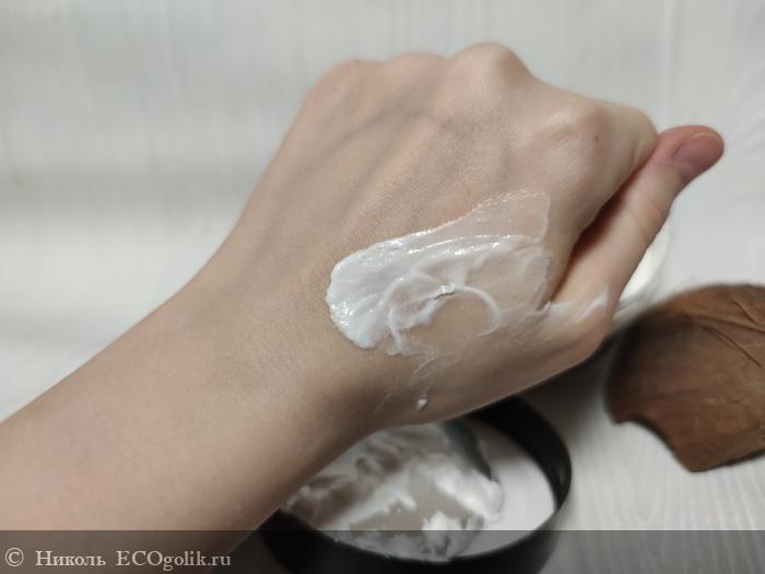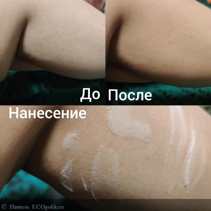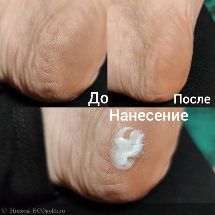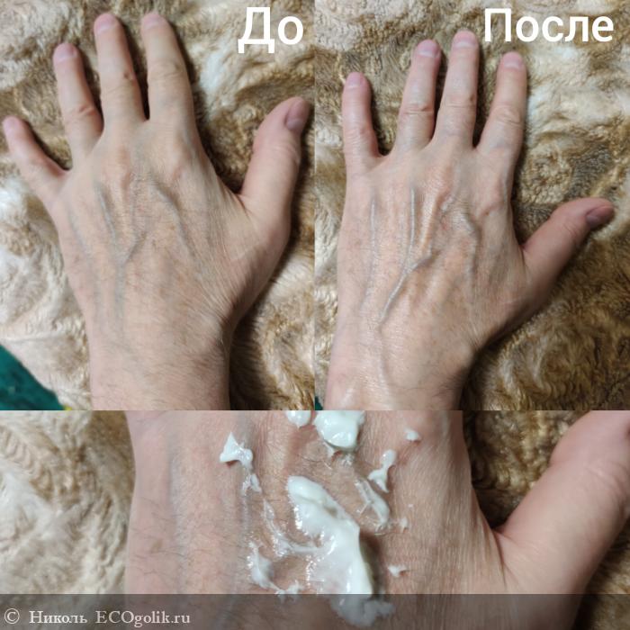 У бренда есть специальные кремы для рук и ног. У меня уже есть: классный крем для рук с амурским бархатом от REAL GREEN (о котором я напишу в следующем отзыве) и замечательный крем для ног "приморские травы" (Тут отзыв на смягчающий крем для ног "приморские травы" от REAL GREEN.). Когда я беру крем для тела, ничего плохого не вижу в том, чтобы его нанести на руки или пятки, ведь это тоже по факту тело. Столько много крема не надо брать, нанесли чисто для фото. Остатки распределили по двум рукам.