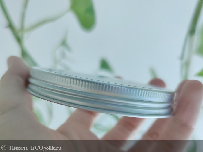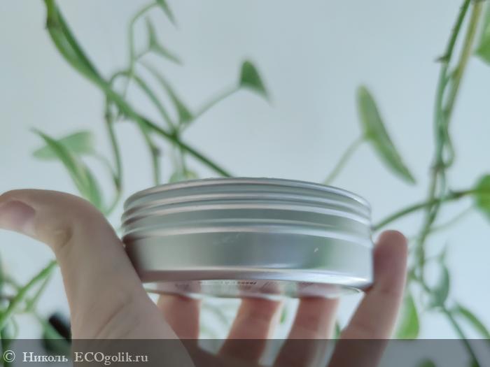 Крем хранится в металлической баночке серебряного цвета в объёме 100 мл. На банку наклеены влагоустойчивые наклейки нежного сиреневого цвета. Есть изображение цветочка. Оформление в стиле минимализма у средства.