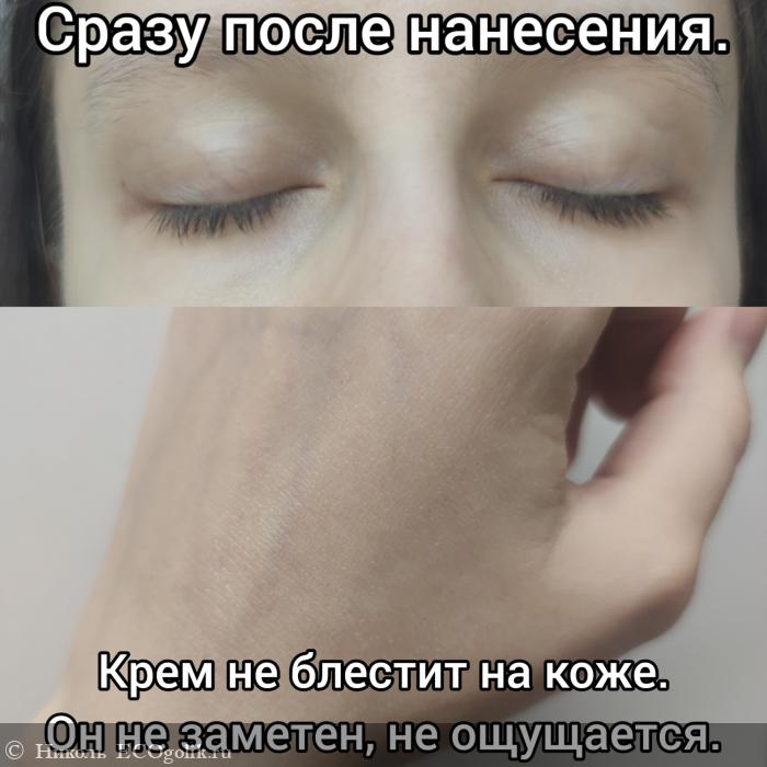 Крем быстро впитывается в кожу, не ощущается и не заметен на ней.
