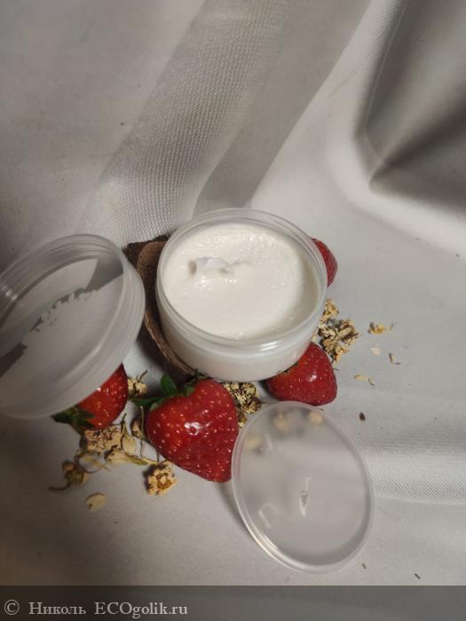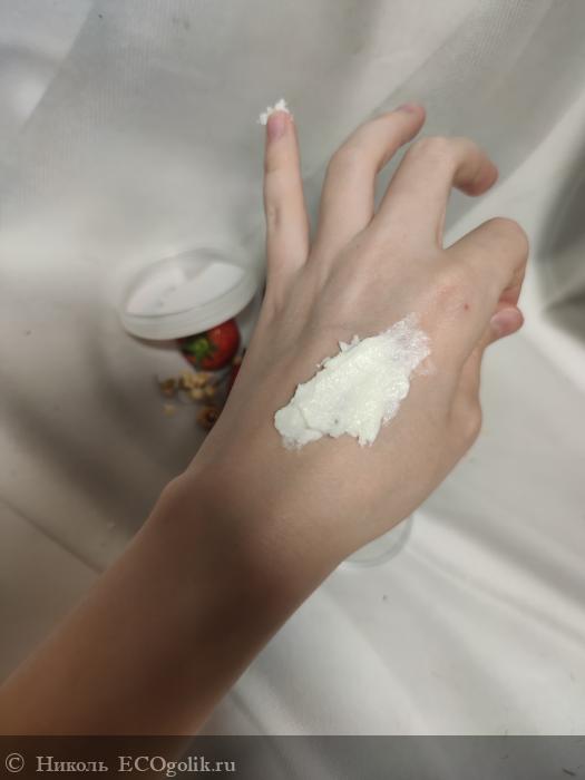 Маска имеет муссовую, густую, но нежную текстуру, если повернуть банку, то она не уползёт, не упадёт. После набора маски шпателем или пальцем, остаётся след и он так и останется, вплоть до следующего использования маски.