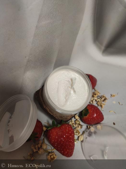 Аромат имеет приятный, клубничный. Если сравнивать с муссом, он тут менее яркий. Аромат напоминает мне сливочный десерт с добавлением клубнички. На волосах после смывания маски аромат надолго не остаётся, ощущается около 2 часов.