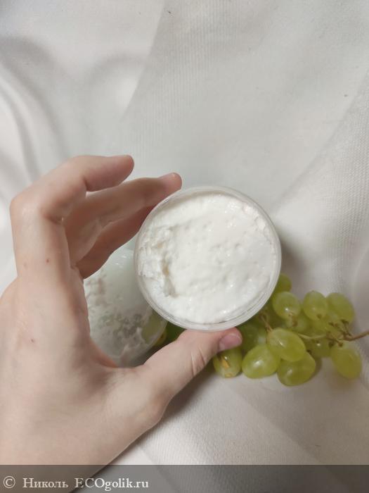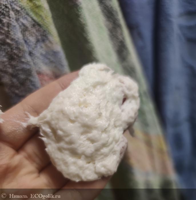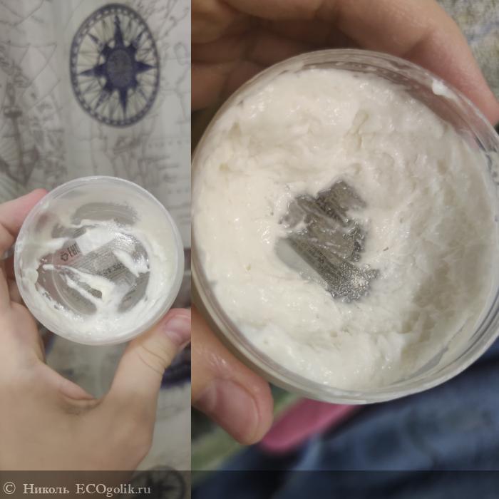 Напоминает суфле. Если перевернуть банку, маска не выльется, она имеет густую консистецию. Когда Вы набираете это средство пальчиками или шпателем, то на масочке остаётся след.